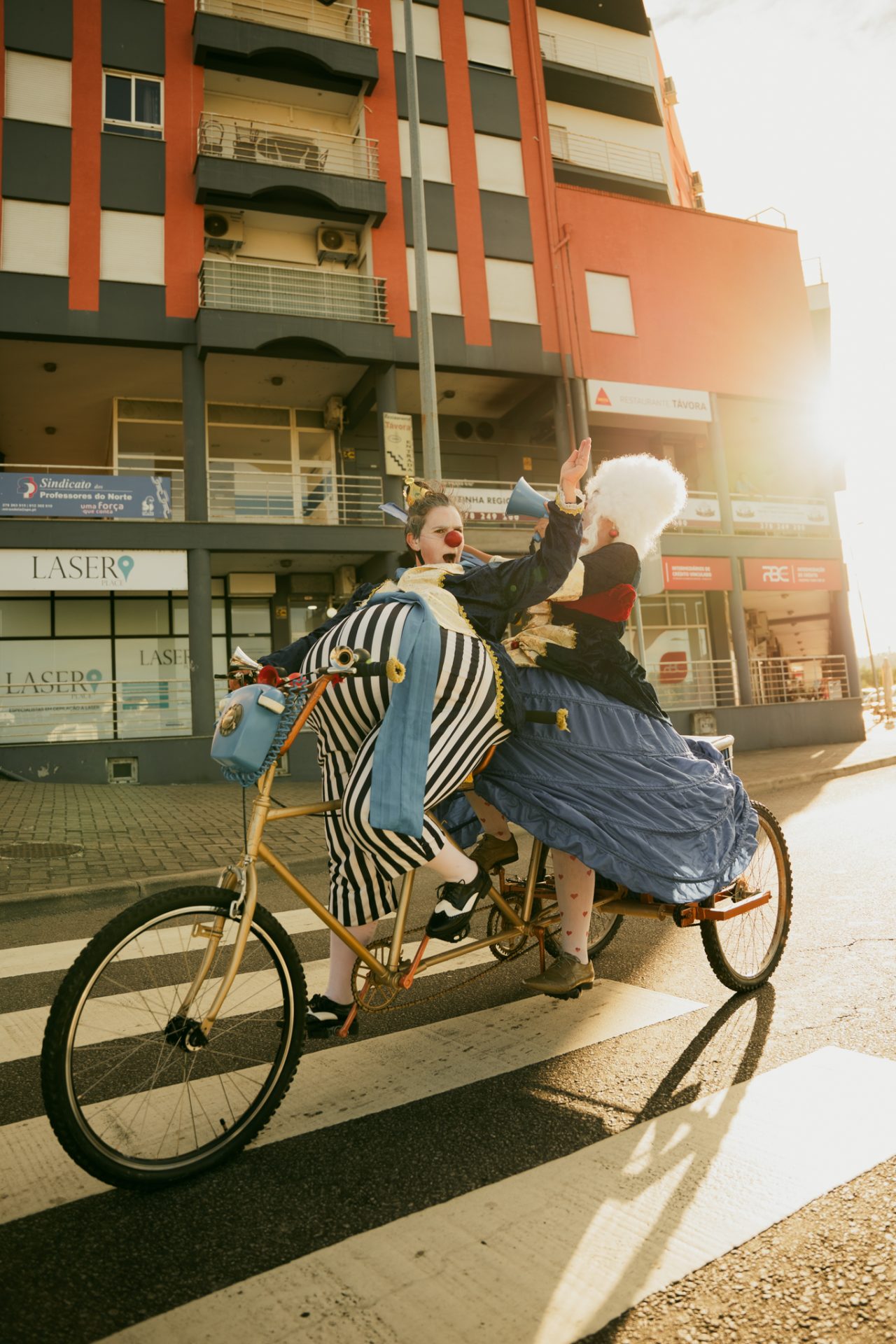 A bordo da sua original carruagem, uma tandem clown, esta realeza palhaça atravessa as ruas criando situações poéticas e inesperadas. Perdidos do seu reino procuram uma forma de voltar tentando para isso pedalar até às nuvens mas há um problema…e não conseguem descolar!